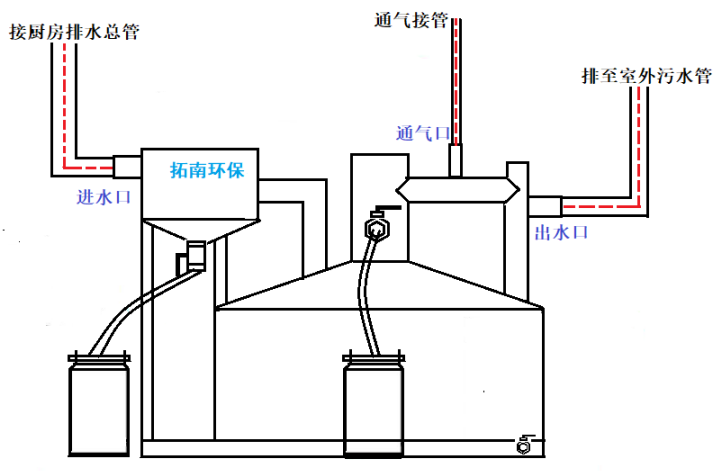 ? 污水經(jīng)油水分離倉底部流出,經(jīng)過虹吸裝置,利用虹吸原理,使得污水排入市政管網(wǎng)