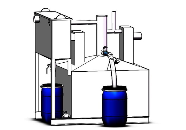 各類餐飲業(yè)含油脂、雜物的廢水自流進(jìn)入設(shè)備內(nèi),經(jīng)過固液分離裝置去除餐飲廢水中的雜物使得含油污水通過傳輸管進(jìn)入隔油區(qū),通過隔油區(qū)的斜坡式結(jié)構(gòu)增大油水分離區(qū)域,提高油水分離速度并通過虹吸原理排出油水分離后的底部污水而水面廢油匯集于隔油區(qū)的儲(chǔ)油區(qū),通過放油閥排出,從而達(dá)到除渣、隔油效果。